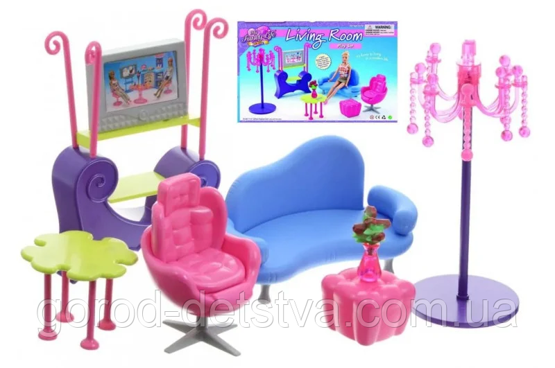 Лялькова меблі Gloria Вітальня 2904 в комплекті диванчик пуф-столик торшер аксесуари